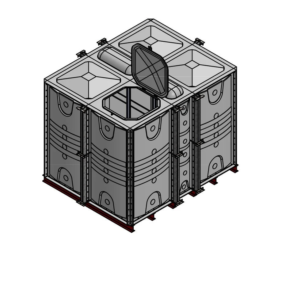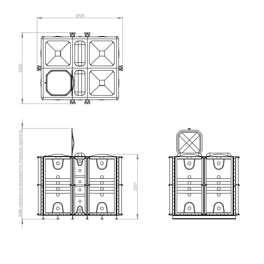 10000 Litre GRP Sectional Water Tank, a sectional tank with an internally flanged base and externally flanged sides. Modular construction utilising bolt together panels suitable for on-site assembly. Comes with man way access