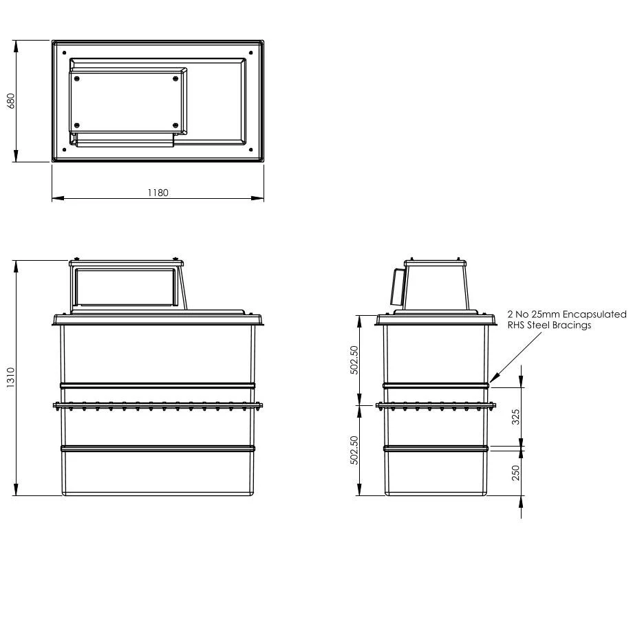 Manufactured to meet BS7491 Parts 1 and 2, using the highest quality GRP materials, ensuring a long service life with minimal maintenance requirements. Delivery generally 2 weeks. Grey colour as standard (other RAL or BS colours are available at additional cost). Only materials of the highest quality are used along with a highly efficient manufacturing processes. This combination ensures that these tanks are of the highest quality available. All internal surfaces, including the lid, have an Isophthalic white gel coat layer which provides a clinical smooth surface which will not support the growth of microbiological organisms. This gel coat layer is reinforced by the main GRP laminate, which provides the main structure of the tank body. The materials used are of the highest quality and applied with exacting production standards to assist in prevention of osmotic blistering. Further reinforcement is provided by square section steel tubing with fully welded corner joints. Steel reinforcement ensures that the softening and general deterioration encountered with timber supports is avoided, thus providing full structural reinforcement for the life of the tank.