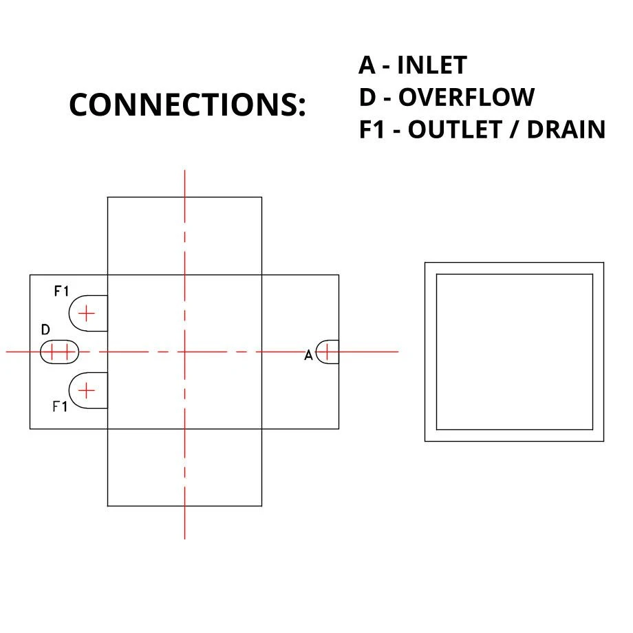 The tank is supplied with 2 low level connection pads, on the opposite end to the inlet.