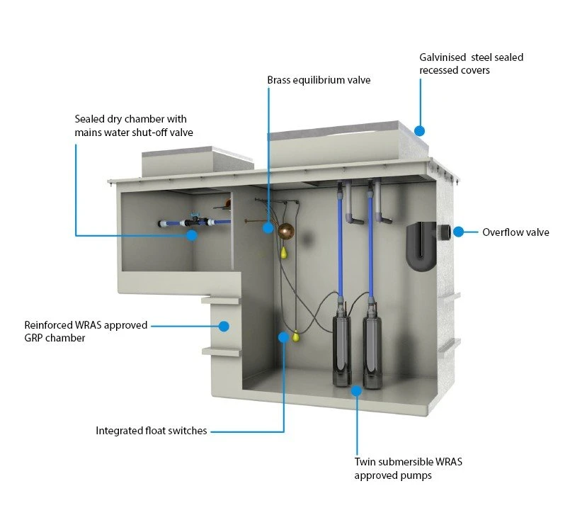 This product has been desinged to increase pressure of your mains cold water supply. the below ground chamber is supplied as a sealed enclosure with separate access points for isolation valves, inverters, and electrical connections. The AquaPod Mini comes with a single size chamber of 2000 litres with a twin submersible pump arrangement in a duty and assist format.