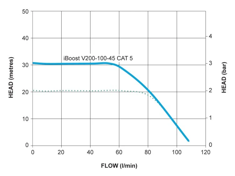 Mainsboost iBoost provides a boosted cold water supply of up to 100 litres per minute and up to 4.5 bar pressure, with a typical performance of 60 litres per minute at 3.0 bar pressure to inadequate flow rates and water pressure, offering a better solution..